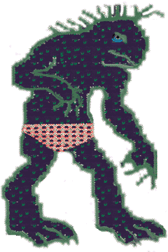 Gamma Gargoyle +-----------------------------------+----------------------------------------+ |VALUE CHARACTERISTIC COST BASE PTS|NAME: unpronounceable | | 16 Strength x1 10 6|HERO ID: GAMMA=GARGOYLE | | 18 Dexterity x3 10 24|PLAYER: Davis | | 53 Constitution x2 10 86|----------------------------------------+ | 23 Body x2 10 26| PTS POWERS END| | 10 Intelligence x1 10 0| 32 16/16 Armor (Mutant Powers),only | | 10 Ego x2 10 0| works 8 or less versus | | 2 Presence x1 10 -8| magic/psychic(-1/2) | | 0 Comeliness x1/2 10 -5| 16 13/13 Armor (kevlar), | | 15 Physical Defens x1 3 12| "radioactive swim trunks",12- | | 15 Energy Defense x1 11 4| Activation(-3/4),OIF(-3/4), | | 5 Speed x10 2.8 22| unbreakable,personal focus,hard | | 14 Recovery x2 14 0| to recover | | 106 Endurance x1/2 106 0| 25 4D6 Absorption (Mutant Powers), | | 67 Stun x1 58 9| "into PRESENCE & STUN | | Characteristics Cost: 176| (half/half)",fade rate: per 5 | +-----------------------------------+ minutes,vs SFX (all powers), | |DISADVANTAGES BASE: 150+PTS| Always On(-1/2),Only In Hero ID | |Distinctive Features,"loud 5| (-1/4),Side Effects(-1/2),Desc: | | plaid kevlar swim trunks", | tends to override psych & go | | easily concealable,minor | enraged,only works 8 or less | |Distinctive Features,"Repulsive 25| versus magic/psychic(-1/2) | | Amphibianoid",not concealable, | 25 4D6 Absorption (Mutant Powers), | | extreme | fade rate: per 5 minutes,vs | |Enraged,"when PRE is over 35 or 15| physical attacks,vs SFX (all | | Body is less than 8",common, | powers),Always On(-1/2),Only In | | occur 14-,recover 8- | Hero ID(-1/4),Side Effects | |Hunted,"HYDRA",more powerful, 25| (-1/2),Desc: tends to override | | harsh,appear 14- | psych & go enraged,only works 8 | |Hunted,"Dr.Destroyer, 25| or less versus magic/psychic | | Destroyers",more powerful, | (-1/2) | | harsh,appear 14- | 10 High Range Radio Hearing (Mutant | |Public ID,"CNN victim" 10| Powers) | |Vulnerability,"electrical",very 30| 5 Radio Transmit/Receive (Mutant | | common,x2 stun | Powers) | |Dependence,"keep privates 30| 5 Ultraviolet Vision (Mutant | | covered, or dies of | Powers) | | embarassment",uncommon,per | 9 Active Sonar (Mutant Powers), | | phase,2D6 | "only in water",only in water | |Dependence: skin wet daily 10| (-3/4) | |Psychological Limitation, 25| 12 +7 Enhanced Perception (Mutant | | "phobia of scientists, esp. | Powers),"offsets underwater | | female scietific types",very | penalties",with all senses,only | | common,total | in water(-3/4) | |Psychological Limitation, 15| 14 Spatial Awareness (Mutant | | "mistrusts beautiful women", | Powers),"passive sonar in | | common,strong | water",only in water(-3/4) | |Physical Limitation,"3-fingered 5| 5 7 Flash Defense (Mutant Powers), | | cartoon paws",infrequently, | Sight Group,14- Activation(-1/2) | | slightly | 15 +7" Running (Mutant Powers),x4 | |Physical Limitation,"tends to 15| Non-Combat,has turn mode 1| | faint in front of women | 7 +4" Swimming (Mutant Powers),x4 | | doctors/scientists", | Non-Combat,has turn mode 1| | frequently,greatly | 13 Demolitions 16- | |Reputation,"softy pusshover 10| 9 Climbing 16- | | teddy bear, yet ugly",occur | 24 3 Levels,all combat | | 11- | 5 KS: explosives 14- | |Unluck,3D6 15| 28 Damage Class +7DC,"Martial Arts | |Vulnerability, 10| Package" | | Disadvantages Total : 295| 368 : Powers Total | | Experience Spent + 99| 176 + Characteristic Total | | Total Points = 544| 544 = Total Cost | +-----------------------------------+----------------------------------------+ | DISADVANTAGES PTS| PTS POWERS END| | | | | "dehydration/dessication/extre | 1 Style:Fights Like an Animal | | me heat-fire",common,x1 1/2 | 3 Contortionist 13- | | stun | 3 Martial Throw | |seasoned GW campaigner 25| 3 Flying Tackle | | | 5 Choke Hold | | | 15 +16 STR Clinging (Mutant Powers) | | | 10 License to Kill | | | 2 11- Contact: Cpt.Justice | | | 2 11- Contact: DOJ Case Worker | | | Niles | | | 40 Multipower (Mutant Powers) (60), | | | "wrist-bands",IIF(-1/2), | | | unbreakable,personal focus,hard | | | to recover | | | 3u 5D6 Energy Blast (Mutant | | | Powers),vs physical defense,beam | | | attack,Hole in the Middle(+1/4), | | | +2"/DC Explosion(+1) 6| | | 4u 4D6 Killing Attack - Ranged | | | (Mutant Powers) 6| | | 4u 4D6 Drain (Mutant Powers),"vs. | | | PRE",fade rate: per 5 minutes 6| | | 4u 5D6 Flash (Mutant Powers),Radio | | | Group 6| | | 2u 6D6 Energy Blast (Mutant | | | Powers),beam attack,only under | | | water(-3/4),No Normal Defense | | | (+1),Defense: force field, ice | | | shield 6| | | 3u 8D6 Energy Blast (Mutant | | | Powers),beam attack,Penetrating | | | (+1/2) 6| | | 3u 10D6 Hand-To-Hand Attack (Mutant | | | Powers),"stacks with Martial | | | Attacks",Trigger(+1/2), | | | changeable trigger,Desc: strikes 4| | | 2u +47 Strength (Mutant Powers), | | | "ya-hoo",doesn't add to figured 5| | | | | | | +-----------------------------------+----------------------------------------+ ORIGIN: transported cross-dimensionally from a gamma-world future. TACTICS: clings high on a wall and blasts away from around a corner PERSONALITY: strange, yet alien somehow. COSTUME: goofy swim trunks are part of his physique now. POWERS/SPEC-FX: radiation inspired mutations,non-psionic BACKGROUND NOTES: . . Gamma Gargoyle (He calls himself Zegrax) was born a simple batrachian in a fetid swamp. In Gamma World. He mutated and became quite a mover and shaker in the jungle basin. Then one day, in the dominance games that young mutants play with each other, a budding young jackalope with Time Field Manipulation sent him hurtling sideways in reality. He woke up outside the marshy ground just south of Montgomery. When the fog cleared, he sat up and looked into the soft young eyes of Dr. Felicia Kerber, the head geneticist of a disreputable lab that was a combo research lab/money-laundering front for Dr. Destroyer. He escaped, met some heroes, and the rest is history...